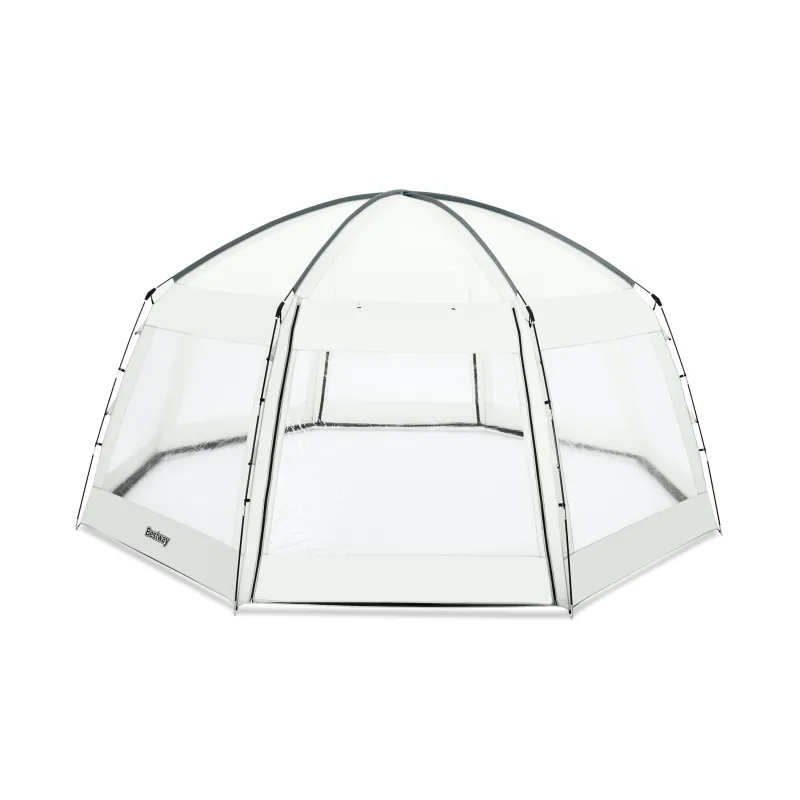 Créez votre propre oasis directement dans votre jardin avec le dôme rond pour Piscine Bestway® ! Compatible avec tous les spas et piscines gonflables jusqu’à 4,88 m de diamètre, ce dôme peut vous offrir une certaine intimité et vous protéger de la pluie, du soleil ou des autres éléments météorologiques. Ce dôme de piscine dispose d’une conception unique à 2 épaisseurs, avec une protection UPF 50+ pour empêcher les rayons UV de passer à travers. Le processus d’installation est similaire à celui d’une tente de camping et prend environ 30 minutes. Lorsque le dôme est installé, vous pourrez toujours accéder facilement à votre piscine ou à votre spa tout en profitant de votre jardin, grâce à l’une des deux entrées et les 8 grandes fenêtres.