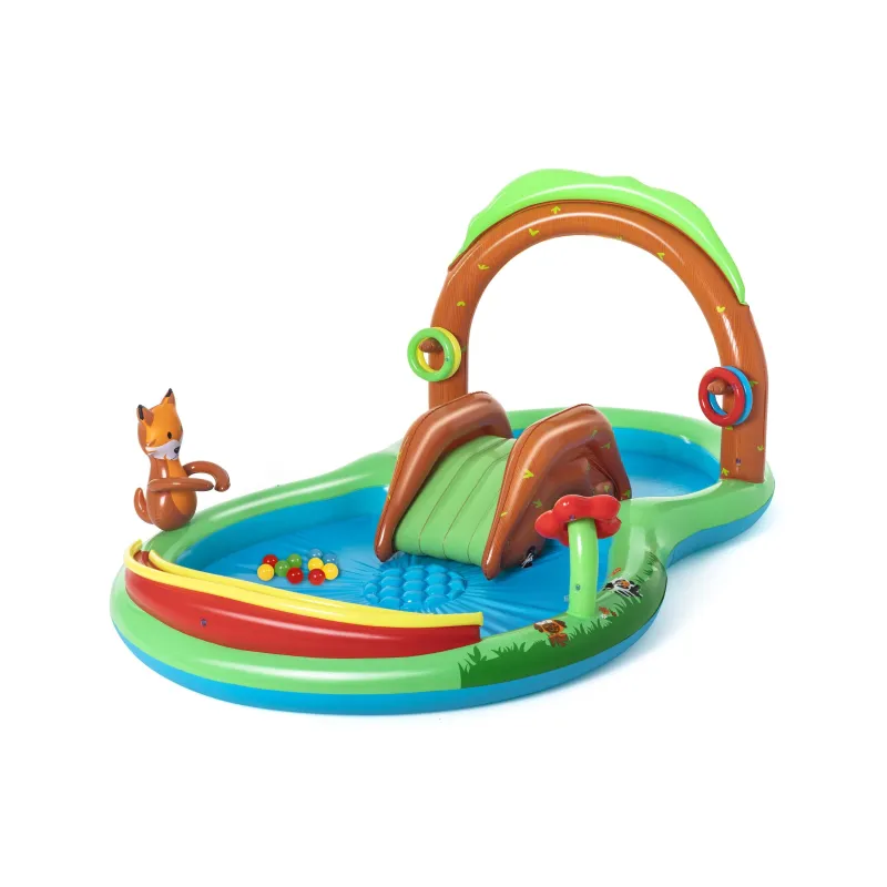 Il ne se passe que du bon temps dans ce coin de forêt ! L’aire de jeux avec pataugeoire Friendly Woods de Bestway® a plus d’un tour en réserve pour divertir les enfants pendant des heures. Les deux pataugeoires sont reliées entre elles par un toboggan et la fleur est également un pulvérisateur d’eau intégré. Les enfants peuvent jouer avec le cylindre labyrinthe, tirer des paniers avec le renard et lancer des anneaux sur les aspérités des troncs d’arbres. Ces jeux sont non seulement amusants, mais favorisent aussi le développement de la coordination oculomanuelle ! Dix balles de jeu et quatre anneaux gonflables sont inclus. Installer, démonter et ranger cette aire de jeux est un véritable jeu d’enfant.