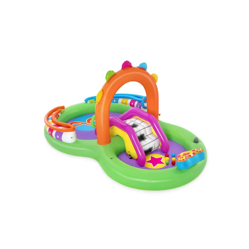 Jouez cet été avec l’aire de jeux Bestway® Sing 'n Splash ! Les enfants peuvent laisser libre cours à leur goût pour la musique et barboter au soleil avec les nombreuses possibilités de jeu et tous les instruments de musique gonflables. Cette aire de jeux comprend un micro et un tambour avec lesquels les enfants peuvent commencer leur concert, les incitant à utiliser leur imagination. La double pataugeoire offre deux aires de jeux reliées par un toboggan amovible. Le fond de la piscine dispose d’un coussin d’atterrissage gonflable pour plus de confort lorsque les enfants utilisent le toboggan. L’arche de l’aire de jeux comprend un brumisateur qui arrose les enfants et le toboggan, ainsi qu’un jeu de lancer d’anneaux amusant. Les enfants peuvent également faire rouler les balles de jeu incluses le long de chacune des deux rampes sur la partie extérieure de l’aire de jeux, ce qui leur permet de s’amuser tout en développant leur coordination œil-main et leur dextérité. Raccordez simplement un tuyau d’arrosage, et c’est parti pour le fun !