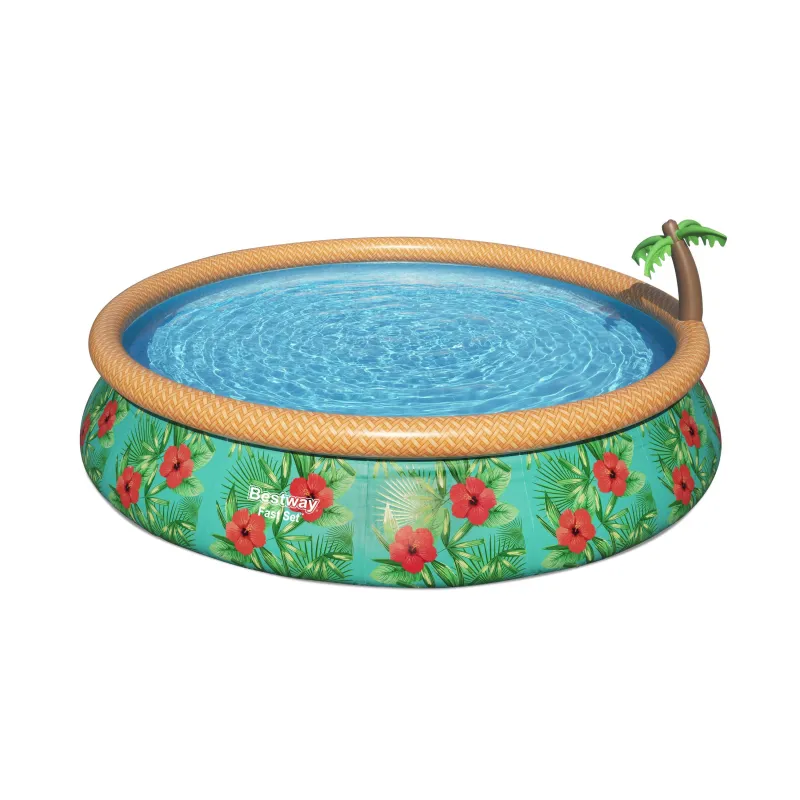 Avec son décor tropical, la piscine gonflable Paradise Palms est la version tendance de la piscine Bestway Fast Set et sera prête à utiliser en un rien de temps pour vos journées estivales ! Le robuste liner est fabriqué en Tritech, un matériau renforcé d’une grande durée de vie qui accroît sa solidité et sa résistance aux perforations. L’anneau supérieur est également équipé d’un palmier gonflable qui pulvérise de l’eau lorsqu’il est connecté à un tuyau d’arrosage pour vous garder au frais toute la journée. Le montage est simple : choisissez une surface plane, gonflez l’anneau supérieur et la piscine se redressera toute seule au fur et à mesure qu’elle se remplira d’eau. Cette piscine est livrée avec une pompe de filtration qui se connecte facilement à la piscine pour garder l’eau belle et propre tout l’été. Une fois l’été terminé, vous pouvez la ranger rapidement et simplement. L’eau s’évacue facilement grâce à la vanne de vidange à débit contrôlé, puis la piscine peut être pliée pour un stockage compact durant la basse saison. Vos étés ne seront plus jamais les mêmes avec la piscine Fast Set Paradise Palms de Bestway !