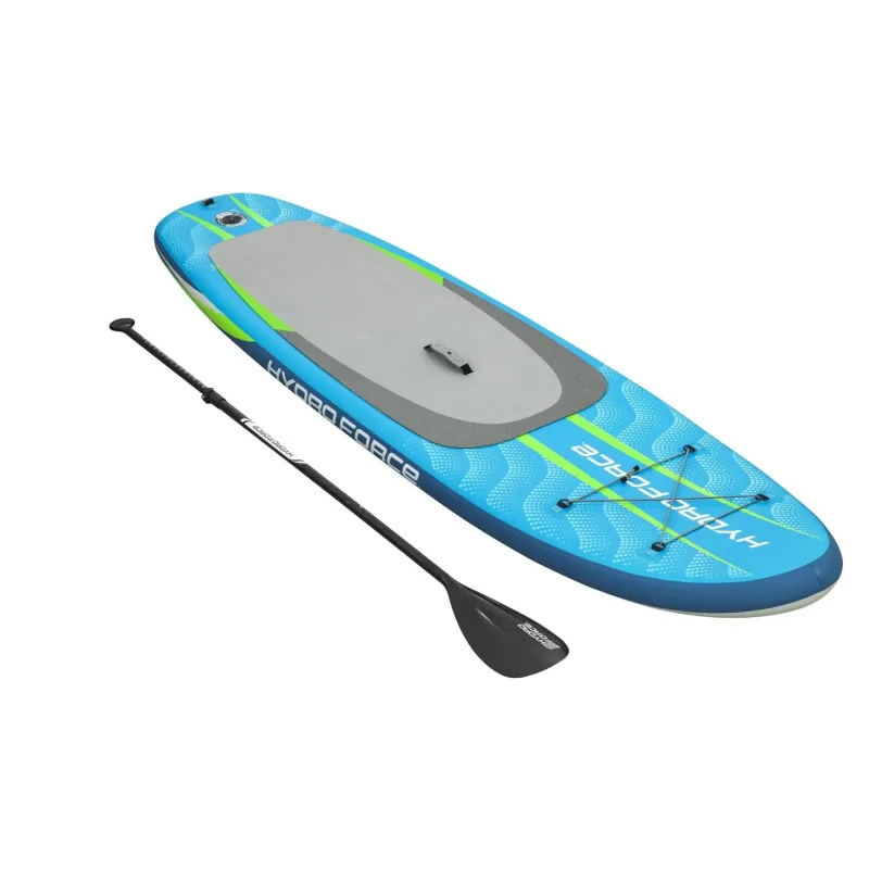 Le kit paddle SUP gonflable Hydro Force Aqua Journey 2,74 m est prêt pour toutes vos aventures nautiques ! Cette planche polyvalente destinée aux loisirs est dotée d’une forme large qui lui permet d’être équilibrée dans toutes les conditions de navigation. Vous vous ferez remarquer lorsque vous serez sur l’eau grâce à son design coloré. Structure résistante : Le SUP Aqua Journey est fabriqué en FortiFiber drop stitch, un matériau composé de milliers de fils internes qui relient la partie supérieure et inférieure de la structure de la planche. Il offre une résistance et une rigidité exceptionnelles, similaires à une planche à parois rigides : la planche de SUP gonflable garde ainsi toute sa légèreté et se révèle très facile à transporter et à ranger. Caractéristiques : Ce kit comprend une pagaie en aluminium dont la longueur s’ajuste parfaitement à la taille de chaque rider. De même, le pad de traction antidérapant est conçu pour vous aider à rester en équilibre et bien stable pendant que vous pagayez. La poignée de pont pratique vous permet de transporter facilement le SUP vers et depuis l’eau. Pour le rangement, vos objets personnels peuvent être amarrés à l’aide des cordons élastiques situés à l’avant de la planche. De plus, le leash spirale de cheville à libération rapide retient votre planche et peut être retiré à l’aide de la languette d’extraction facile à utiliser. Montage et stockage faciles : Lorsque vous souhaitez l’utiliser, il vous suffit de gonfler le SUP Aqua Journey à l’aide de la pompe manuelle fournie et vous êtes paré pour une journée exceptionnelle sur l’eau ! Et lorsque vous avez fini de pagayer pour la journée, la valve d’air vous permet de dégonfler la planche en un rien de temps. Il suffit de retirer l’aileron, d’enrouler l’Aqua Journey, de le ranger dans le sac à dos fourni et de rentrer. Toutes les aventures nautiques sont plus fun grâce au kit paddle SUP gonflable Hydro Force Aqua Journey !